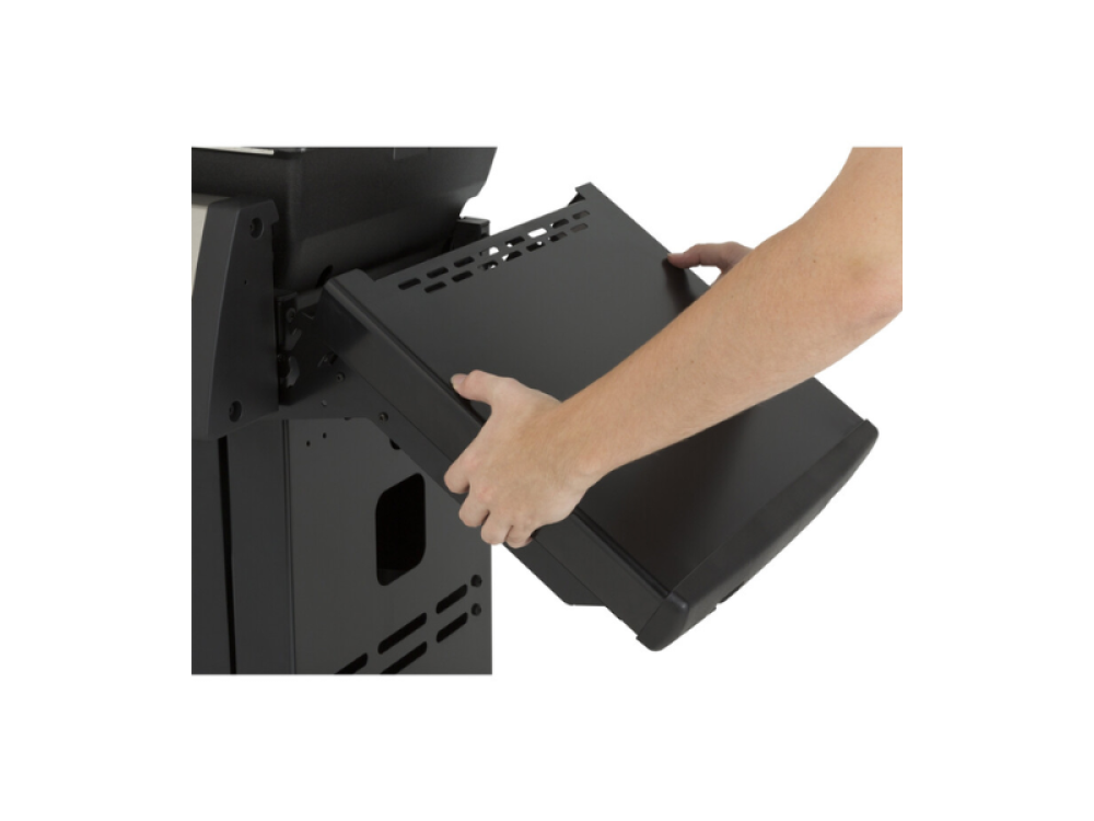 Il barbecue è dotato di ripiani laterali pieghevoli in resina Perma-Mold, che permettono di ottimizzare lo spazio quando non sono in uso. Questa soluzione lo rende adatto a terrazze, balconi e giardini con spazio limitato.
