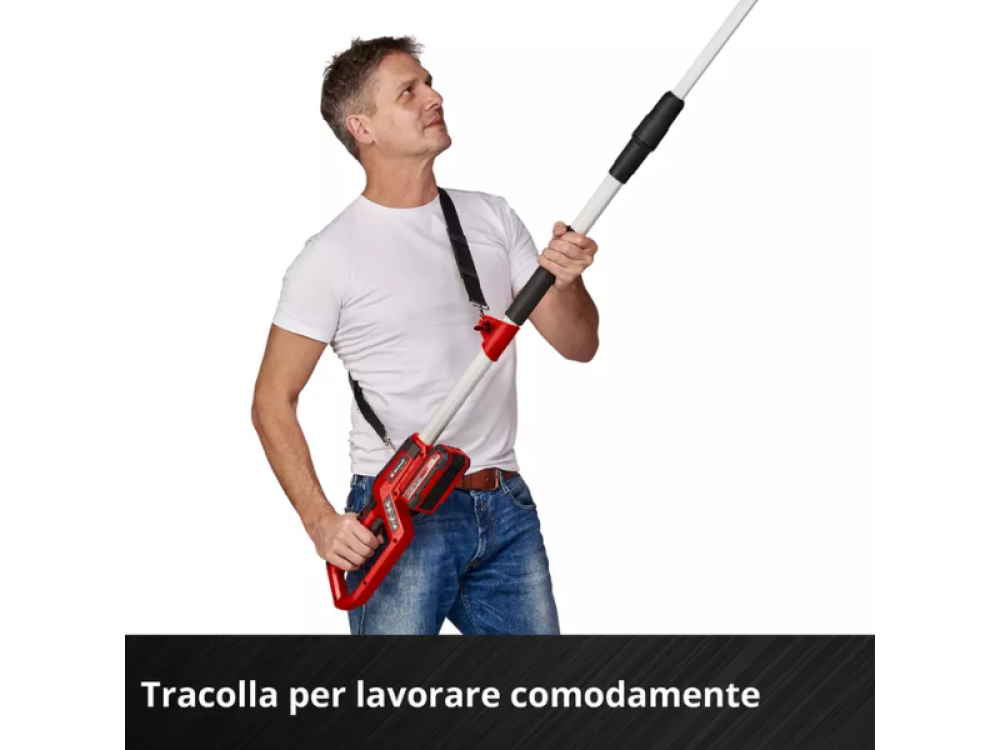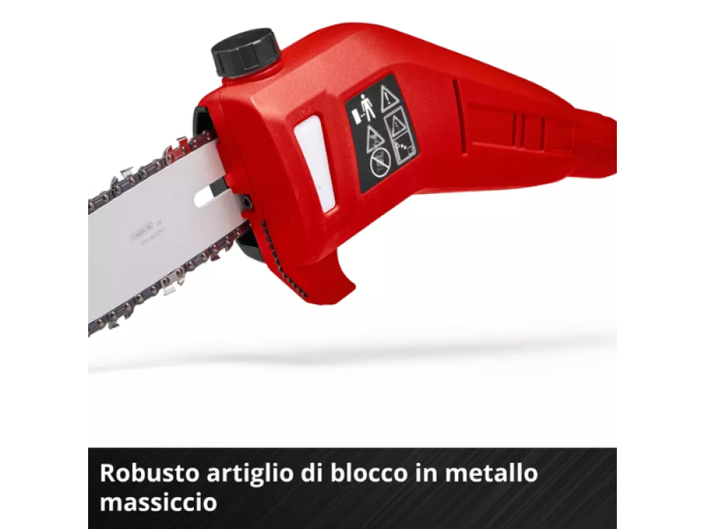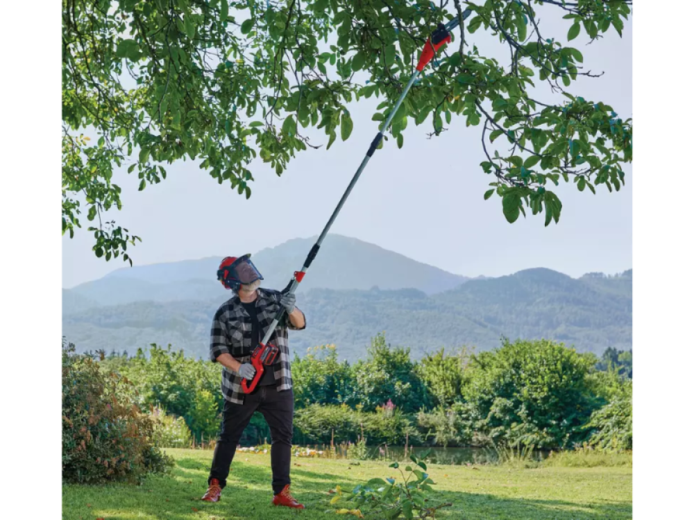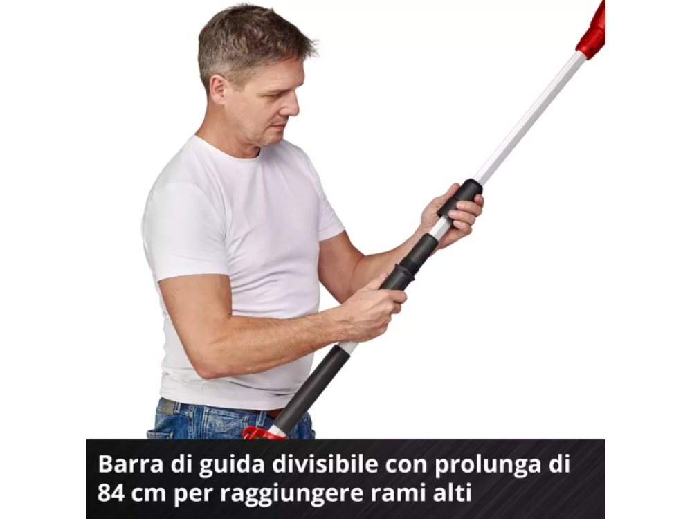 La longueur du guide est de 20 cm, avec une chaîne OREGON de haute qualité et une vitesse de coupe de 5,5 m/s, pour une coupe nette et précise. La tête motorisée inclinable à 30° permet d'atteindre les branches les plus difficiles, tandis que laperche d'extension augmente la portée pour une utilisation flexible.