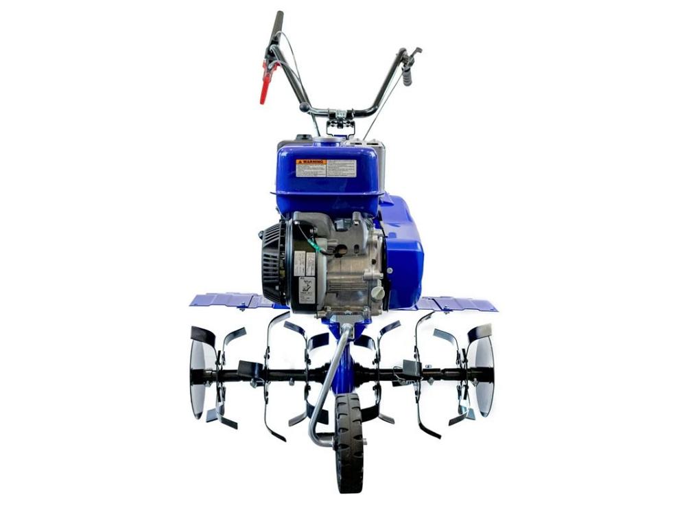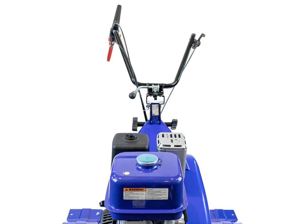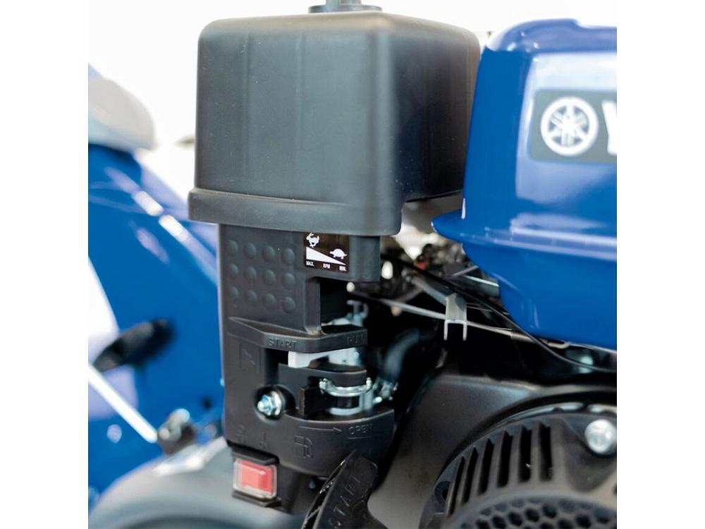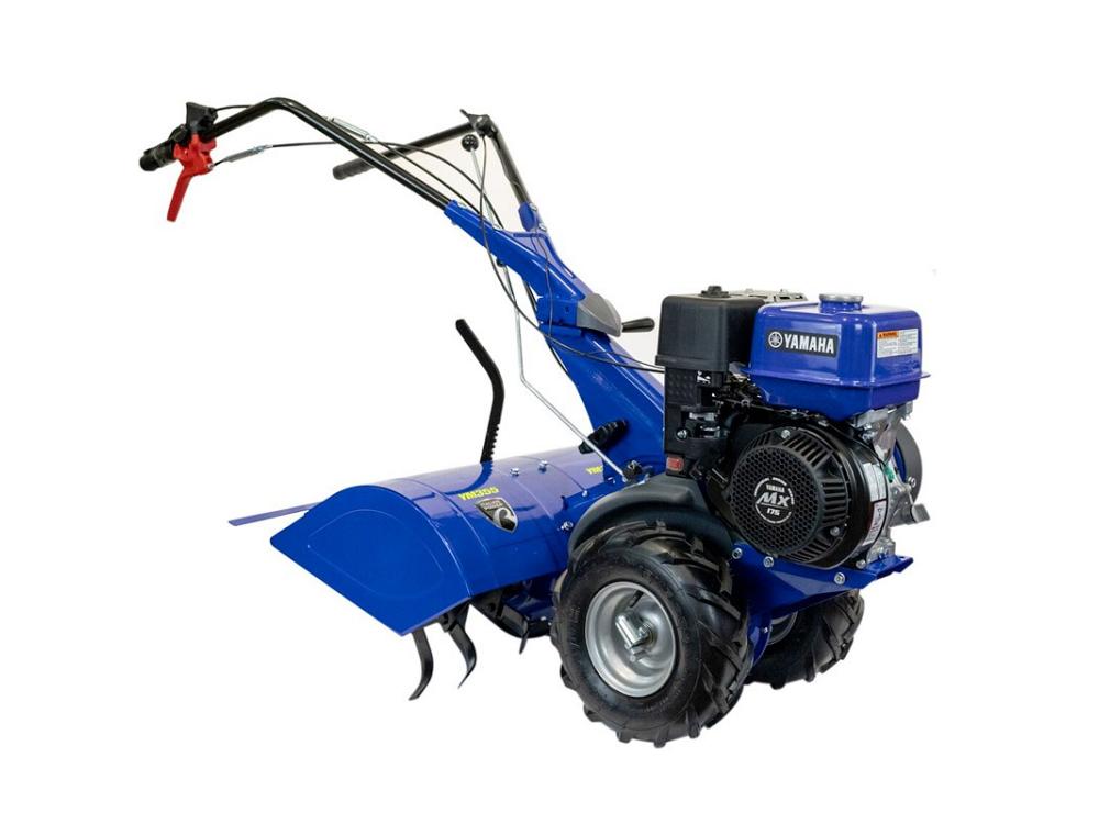 Tracteur marcheur Yamaha équipé d'un motoculteur de 60 cm et d'un moteur à essence 4 temps d'une cylindrée de 174 cm3 et d'une puissance de 3,6 kW, doté d'une transmission mécanique à 2 vitesses avant (1,1 et 2,1 km/h) et 1 vitesse arrière à deux vitesses (10 et 1,8 km/h).