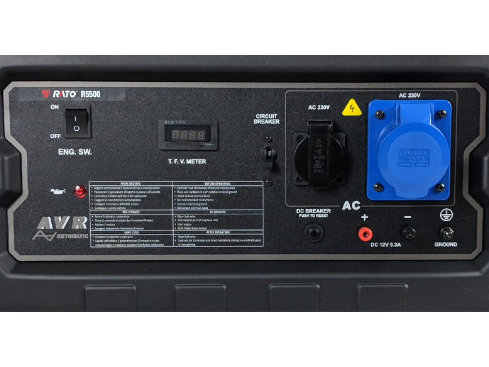 Groupe électrogène monophasé Rato R5500 capable de générer du courant électrique jusqu'à une puissance maximale de 5,5 kW grâce au fiable moteur à combustion interne Rato R390 d'une cylindrée de 389 cc et capable de fournir une puissance de 10 Hp.