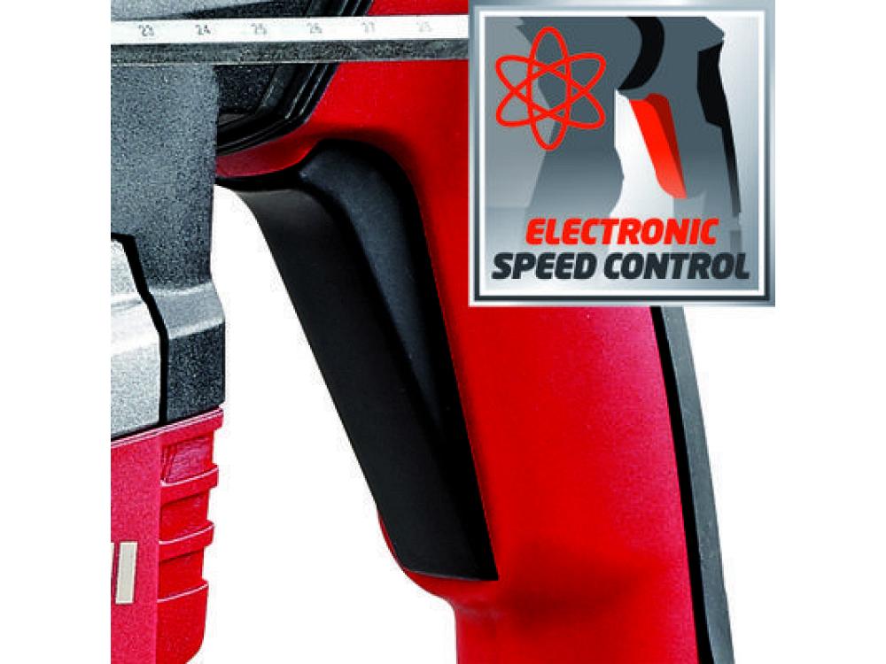 Grâce à la tige de profondeur métallique robuste et réglable, la régularité et la précision du perçage sont garanties. De plus, la poignée supplémentaire avec des nervures de sécurité empêche toute torsion accidentelle pendant l'utilisation. La perceuse Einhell TE-RH 38 E est livrée avec une mallette de transport et de rangement pratique, idéale pour ranger et protéger l'outil.