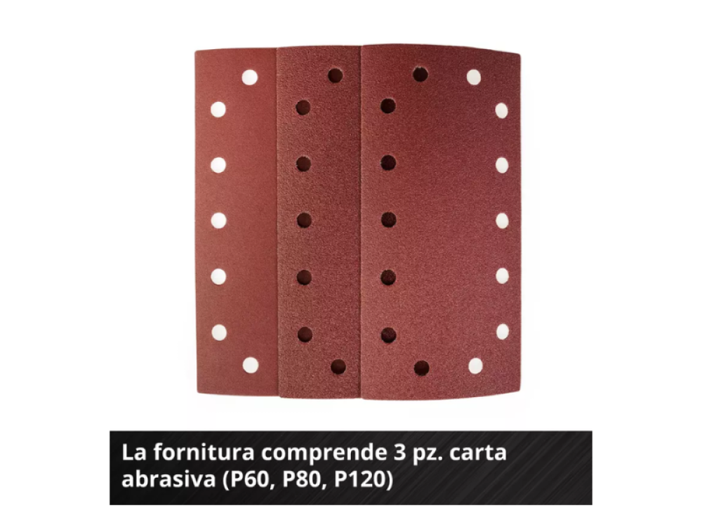 Trois papiers abrasifs de différentes granulométries (60, 80 et 120) sont inclus dans la livraison, afin que vous puissiez commencer à poncer immédiatement. La batterie et le chargeur ne sont pas inclus, mais peuvent être achetés séparément.