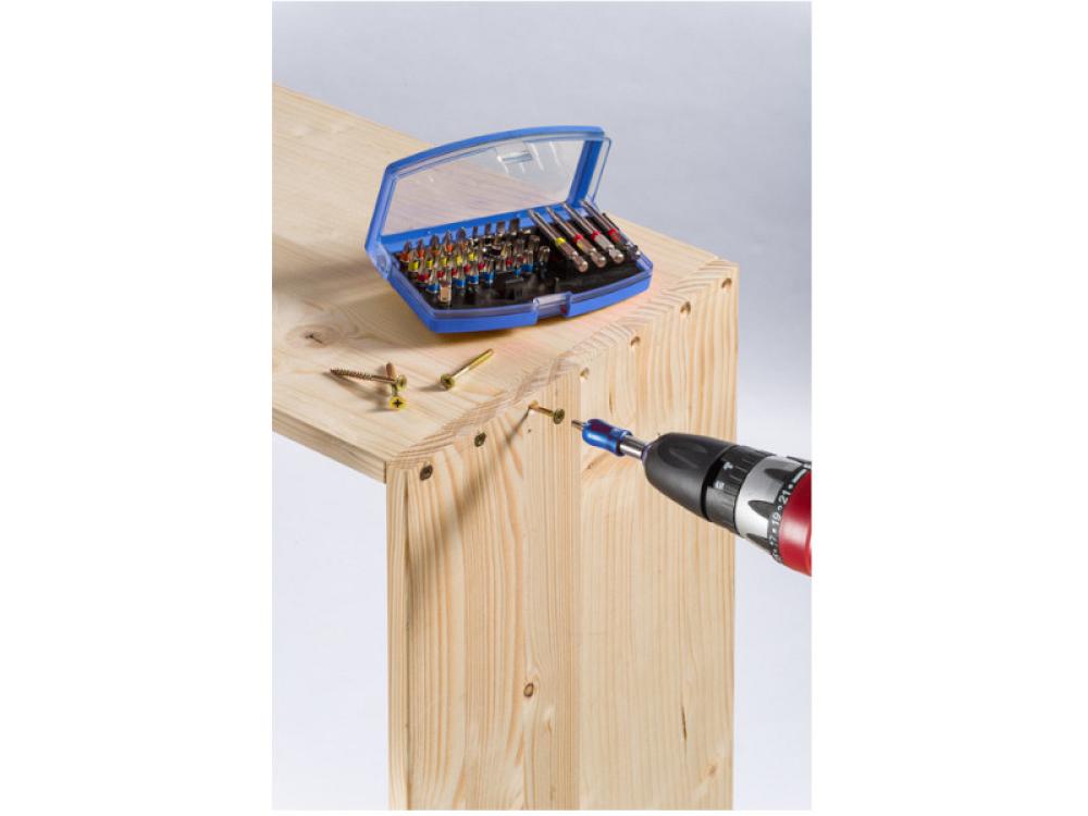 Ce set comprend 40 inserts avec des anneaux de couleur pour une reconnaissance rapide de la taille et une utilisation plus facile. Il est livré avec un cliquet hexagonal 1/4" conforme à la norme ISO 1173, C 6.3, pour une utilisation professionnelle et sûre. Le porte-embout magnétique permet un changement rapide des embouts et est compatible avec les tournevis sans fil équipés d'une douille hexagonale 1/4" ISO 1173, E 6.3. En outre, un adaptateur 1/4" permet d'utiliser des douilles ayant la même taille de tige.