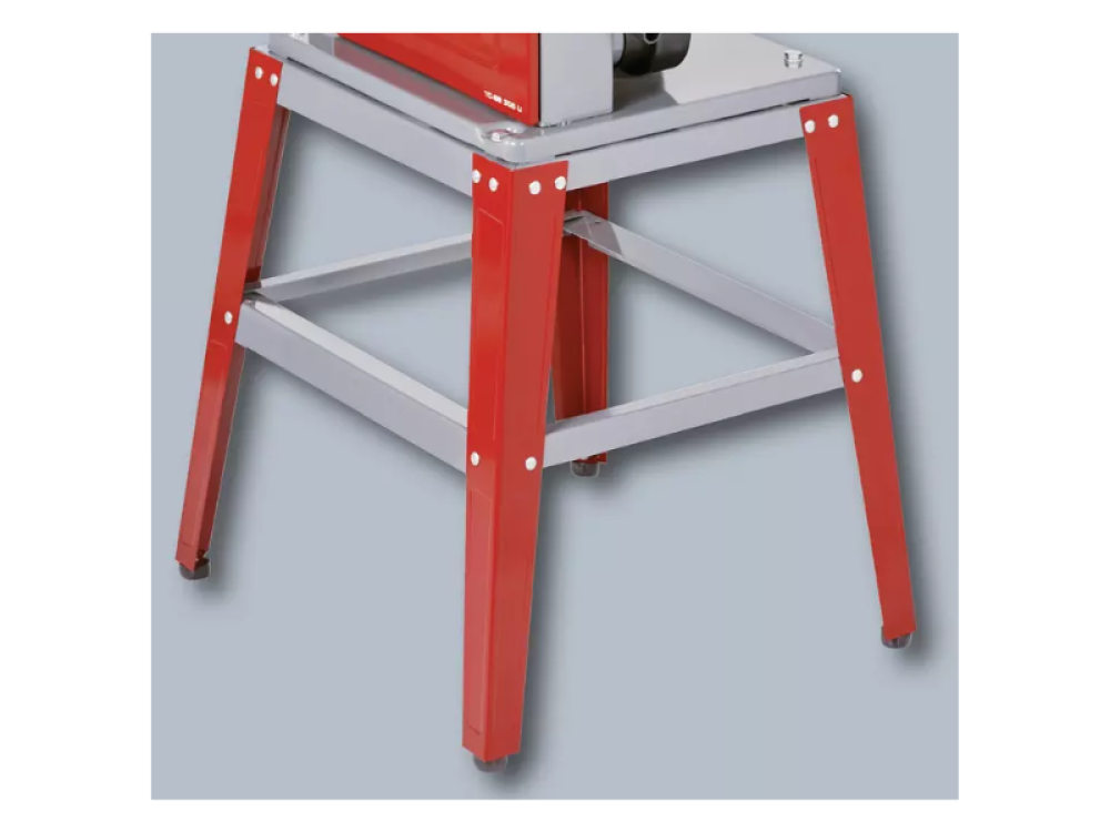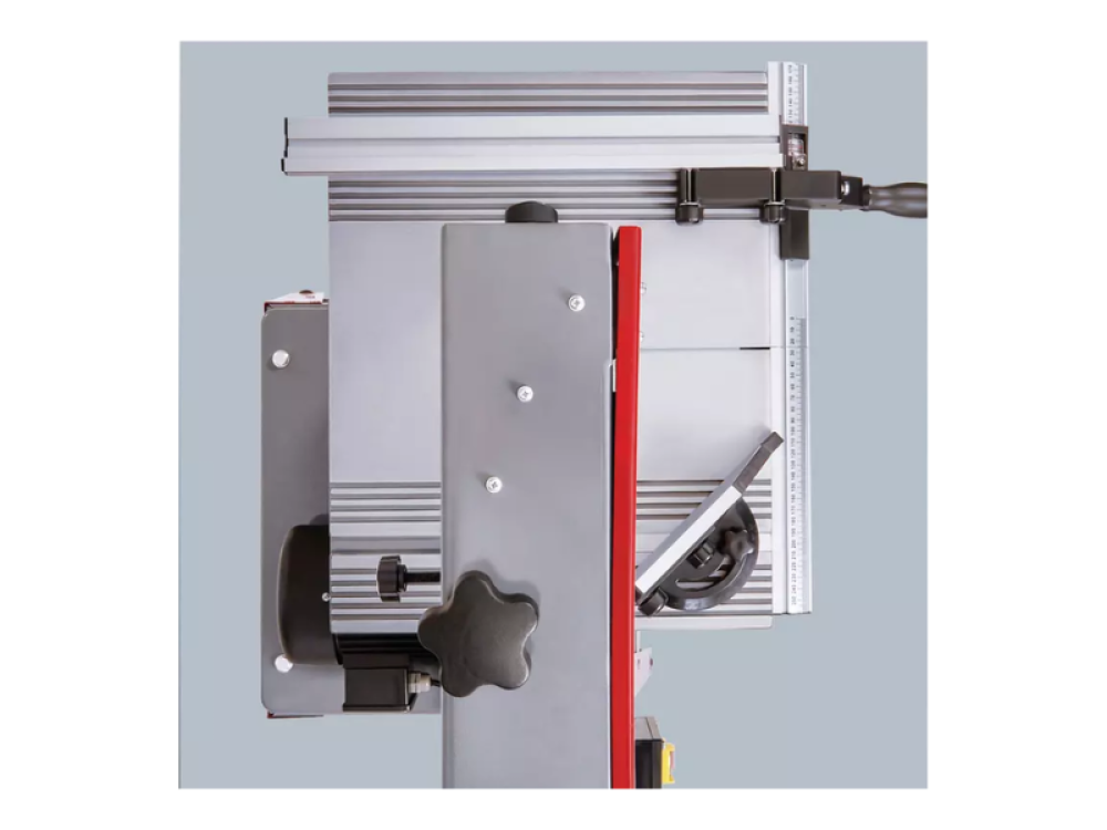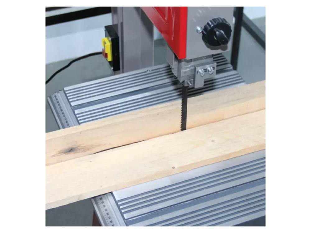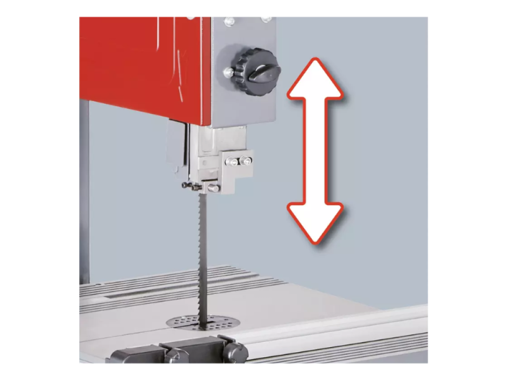La scie à ruban est équipée d'un protège-lame réglable en hauteur sans outil, ce qui renforce encore la sécurité et la facilité d'utilisation. La conception robuste comprend des pieds de support qui assurent une base stable pendant l'utilisation, tandis que le poussoir inclus assure un travail sûr et contrôlé.