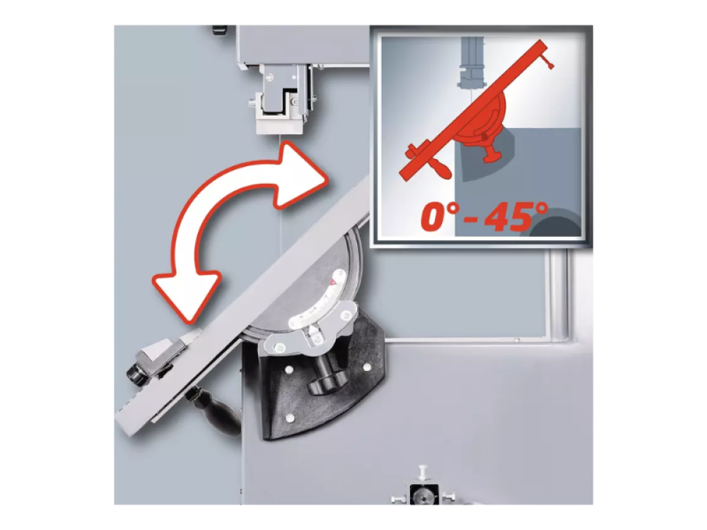 L'utilisateur a la possibilité de réaliser différents types de coupes, notamment des coupes longitudinales, en onglet ou à main levée, grâce à la flexibilité offerte par la table réglable et le guide d'angle. La table de la scie peut être inclinée de 0° à 45°, ce qui permet de réaliser facilement des coupes angulaires. Pour faciliter la précision, la scie est équipée d'un guide parallèle à réglage rapide et d'un guide d'angle réglable de -60° à 60°, permettant à l'utilisateur d'adapter l'outil aux besoins spécifiques du travail.