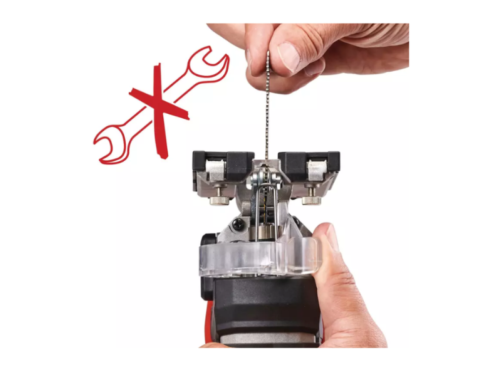 Le contrôle électronique de la vitesse permet d'adapter le travail au matériau, garantissant ainsi la précision dans chaque application. Pour les travaux nécessitant de la rapidité, la fonction pendulaire peut être activée, ce qui accélère la coupe sans compromettre la qualité. Le remplacement des lames sans outil est facilité par le porte-lame universel, qui permet de changer de lame rapidement et sans effort.