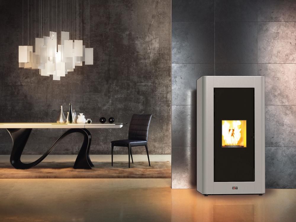 Le poêle à granulés de bois AnselmoCola Rock, aux performances élevées et à la grande autonomie, permet un plus grand échange de chaleur avec un rendement supérieur et la possibilité d'être raccordé ausystème de chauffage, en complément ou à la place de la chaudière existante.