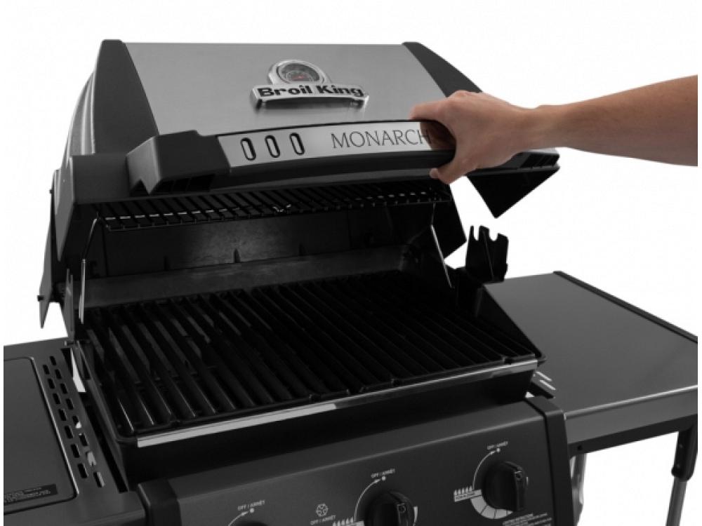 Le Broil King Monarch 340 est équipé d'un meuble de support en acier peint à trois couches avec un compartiment de rangement pour les grosses bouteilles et une porte d'accès avec une nouvelle poignée en acier inoxydable et un couvercle avec thermomètre intégré pour un contrôle constant de la température.