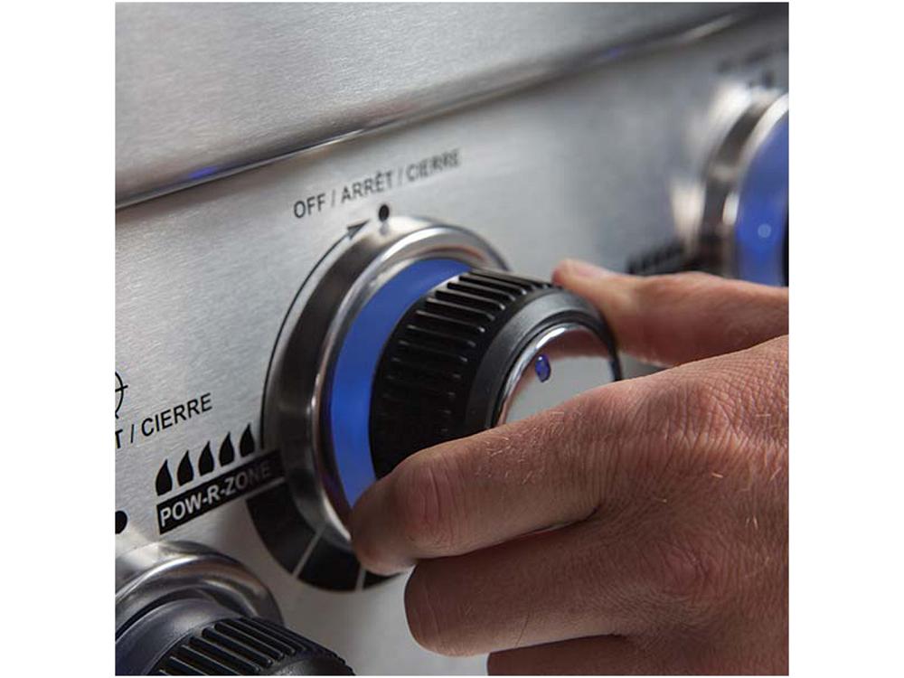 Le barbecue est équipé de barres aromatiques Flav-R-Wavee en acier inoxydable, de vannes progressives à 180° Linear-Flow éclairées par LED, d'un thermomètre à sonde Accu-Temp et d'un système d'allumage électronique Sure-Lite.