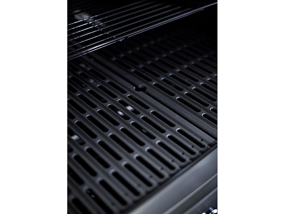 Déflecteurs de flammes en acier émaillé noir, répartis sur toute la surface de cuisson avec une forme en "v" encore plus prononcée pour une meilleure évacuation des graisses de cuisson sans flambées.