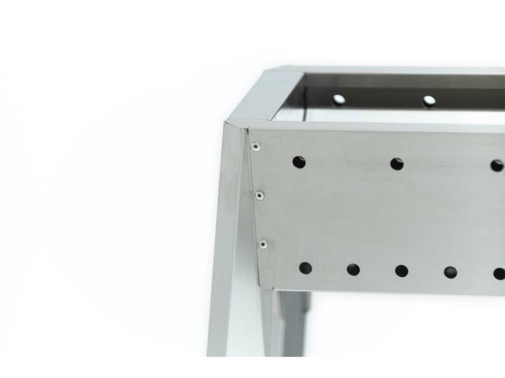 Fabriqué en acier inoxydable AISI 430, ce gril à rôtir est inoxydable, durable et présente un design linéaire et élégant. Il fait partie de la ligne de luxe et incorpore des doubles parois et un double fond, créant un flux d'air qui améliore la combustion et prolonge la durée de vie des braises. Ce système réduit également le risque de brûlures, grâce à l'isolation thermique générée par le passage de l'air entre les parois latérales.