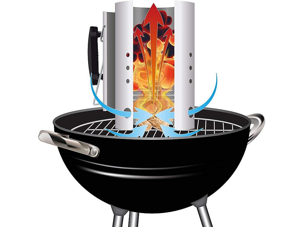 Il suffit ensuite de l'allumer comme d'habitude et d'attendre ; le flux d'air chaud ascendant fournit l'impulsion nécessaire et le charbon de bois est chauffé par paquets sous l'effet de la chaleur intense.