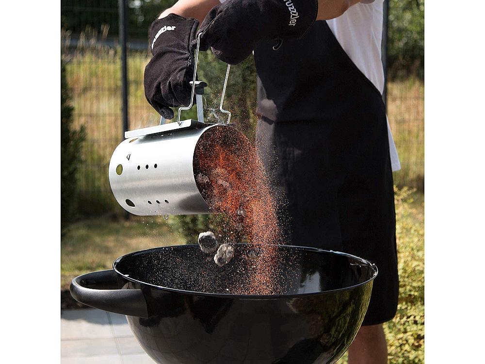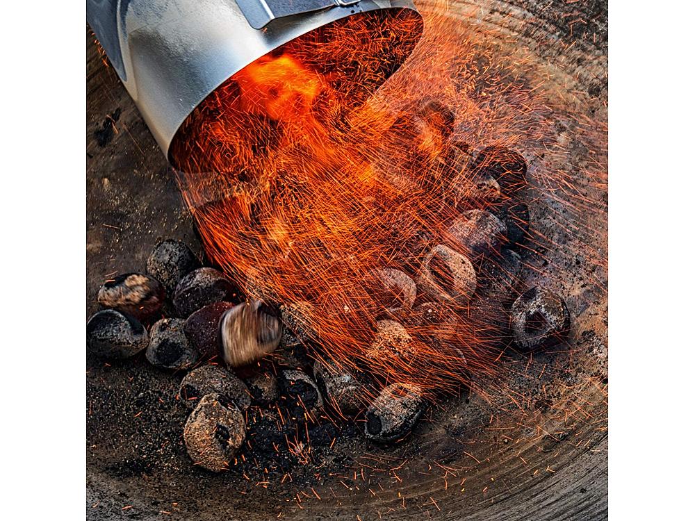 Lorsqu'une couche de cendres légèrement grisâtre se forme sur les morceaux de charbon de bois ou les briquettes sur le côté, vous pouvez verser le charbon de bois chaud dans le gril à l'aide des deux poignées.