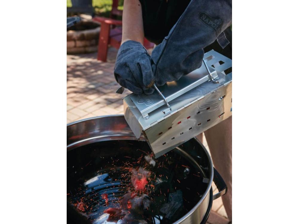 La grille de cuisson facilement accessible et le couvercle rabattable permettent d'ajouter facilement du charbon de bois, tandis que les trois hauteurs de cuisson et la gestion maîtrisée du flux d'air assurent un contrôle précis de la température.