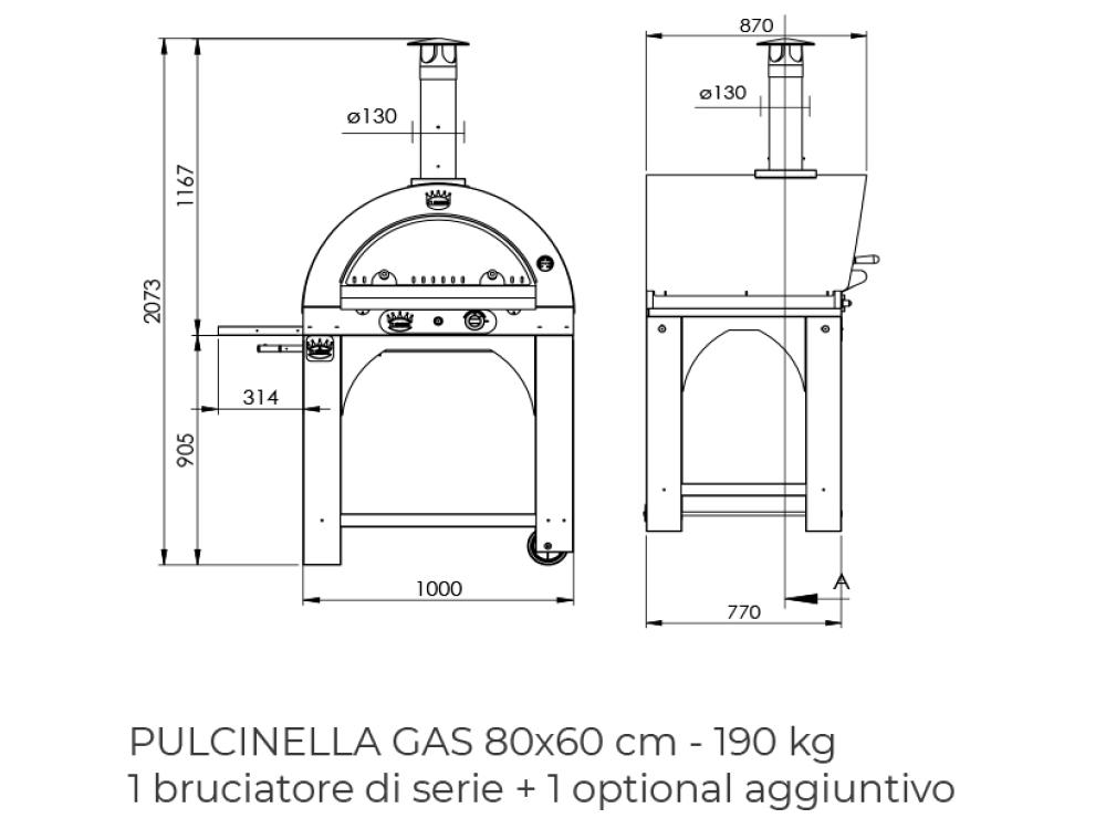 dimensions disponibles de la chambre de cuisson : 60x60 - un brûleur (2 pizzas) 80x60 un brûleur (le deuxième en option) (4 pizzas) 100x80 deux brûleurs (5 pizzas)