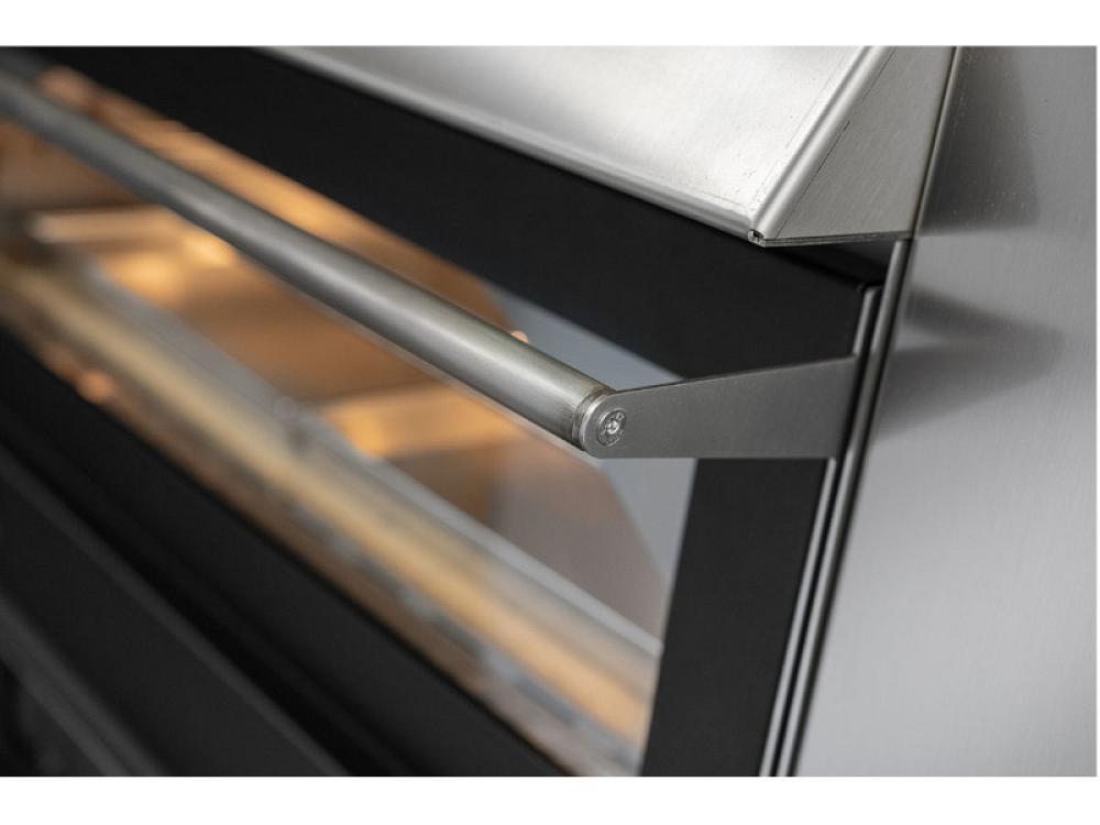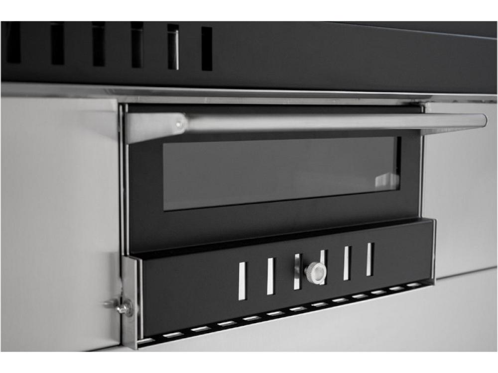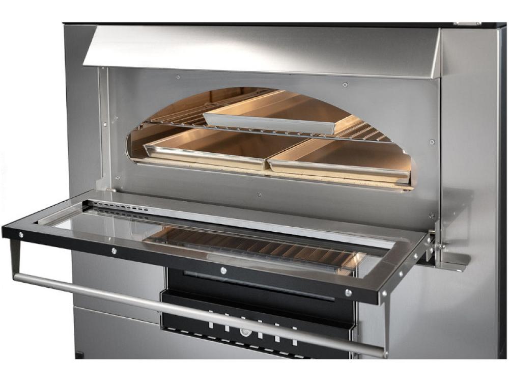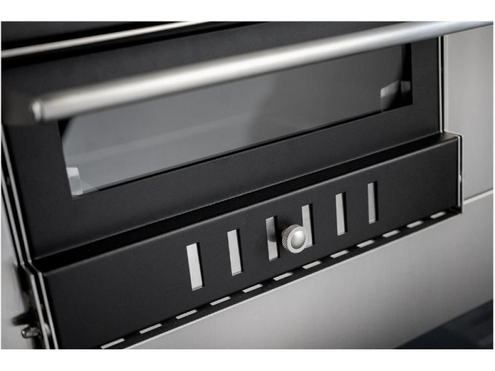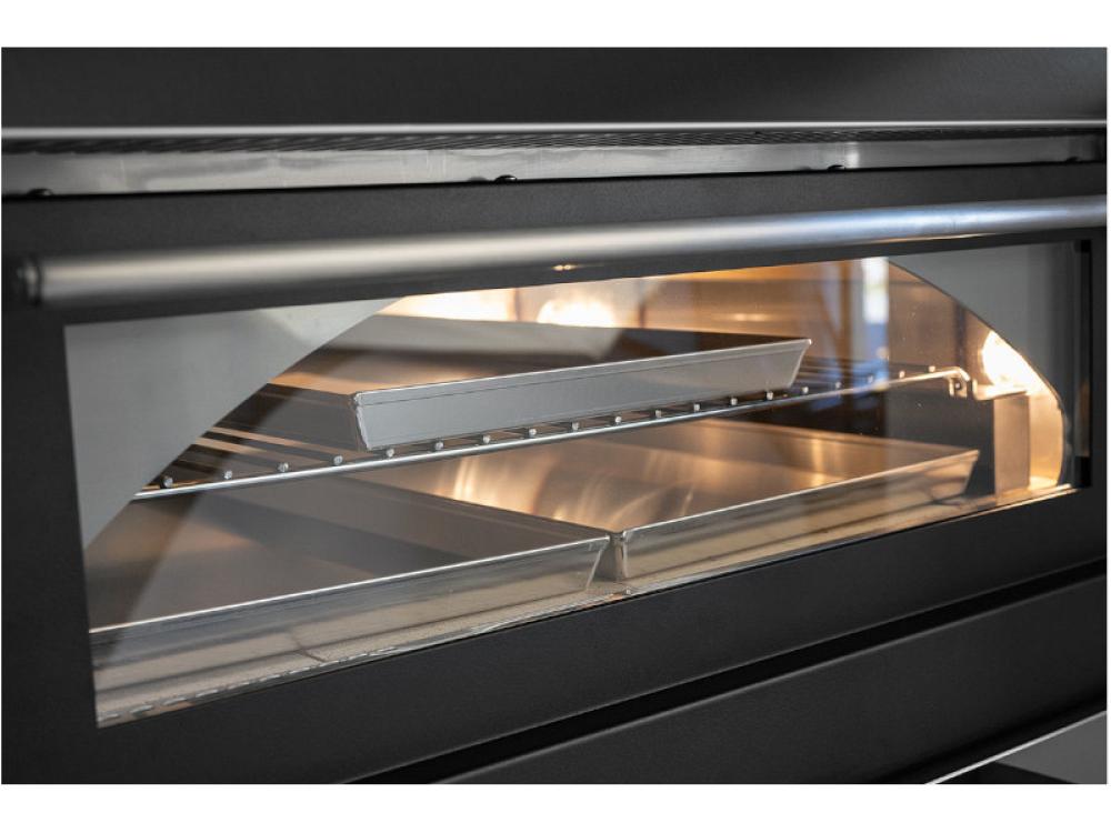 Ce four est équipé de façades en acier inoxydable, de vitres sur les chambres de cuisson et de combustion, de portes basculantes, d'un chariot pour faciliter le déplacement et d'un système de double combustion. La charge de bois est de 3/4 kg, ce qui est idéal pour les longues séances de cuisson. L'équipement standard comprend un gril chromé, trois moules rectangulaires, un récupérateur de poêle, un tisonnier et un gant, ce qui permet d'utiliser le four pour différents types de cuisson.
