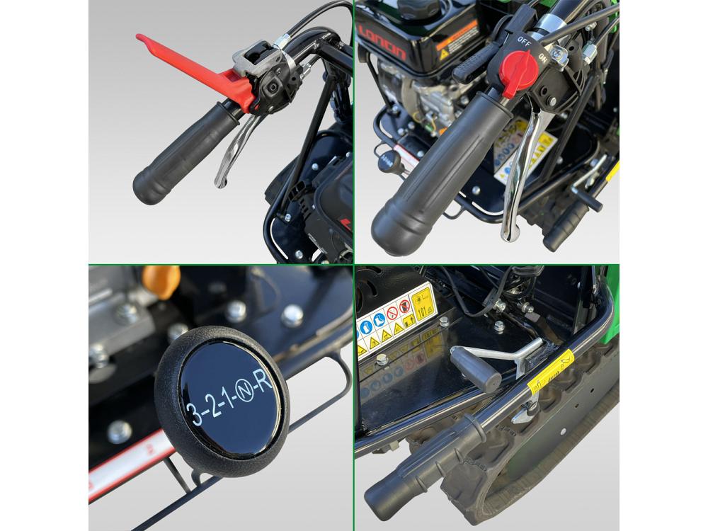 La boîte de vitesses mécanique à engrenages, avec 3 vitesses avant et 1 marche arrière, permet une gestion précise de la vitesse, jusqu’à un maximum de 5 km/h. Chaque chenille est commandée indépendamment et la machine s’arrête automatiquement lors du relâchement du levier de sécurité, assurant ainsi un meilleur contrôle et une sécurité renforcée lors de l’utilisation.