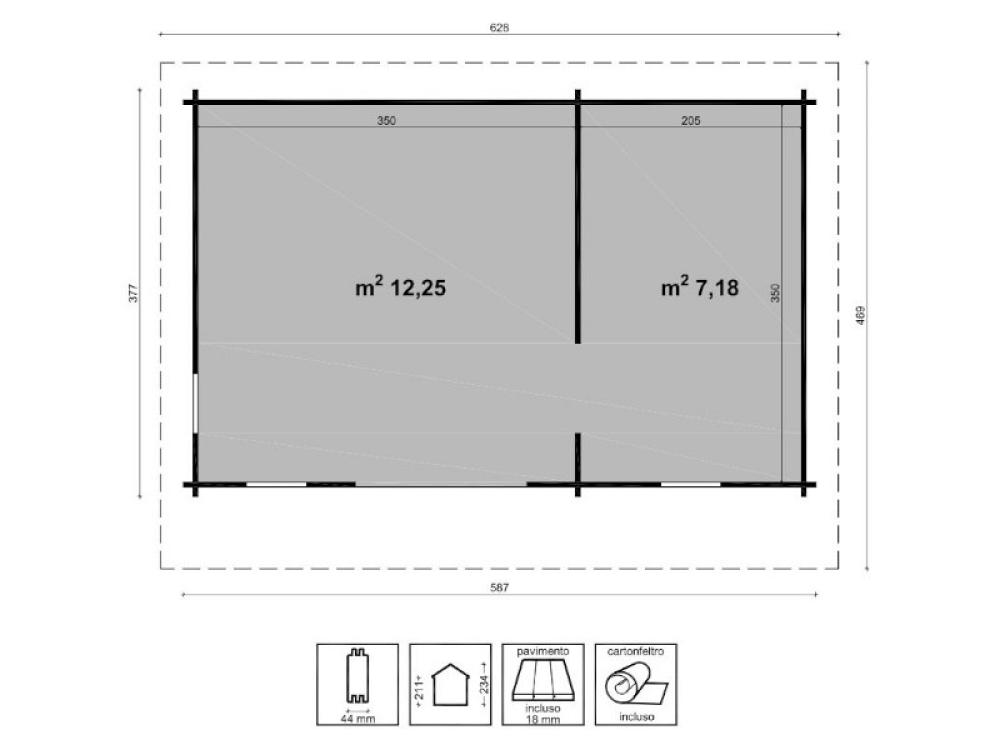 Les dimensions généreuses de 587x377 cm offrent un espace intérieur spacieux et confortable, avec des dimensions intérieures de 560x350 cm et une hauteur maximale de 234 cm, ce qui offre suffisamment d'espace pour une variété d'activités. Équipée de portes et de fenêtres professionnelles, la cabine est dotée d'une double porte avec poignée et serrure, de trois fenêtres à ouverture simple de 56 x 178 cm et d'une seule porte intérieure de 83,5 x 195 h cm, ce qui permet un excellent éclairage naturel à l'intérieur.