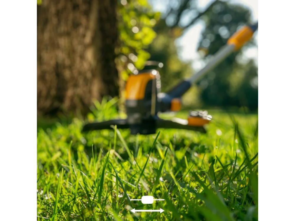 La tête de coupe à double fil nylon avec alimentation automatique garantit une sortie continue du fil, évitant les interruptions pendant le travail. La largeur de coupe de 30 cm permet de réaliser efficacement aussi bien la finition de l’herbe que la bordure des allées et massifs. Grâce à la tête pivotante, il est possible de passer facilement du mode coupe à la fonction coupe-bordures, y compris en position verticale, pour des résultats propres et réguliers.