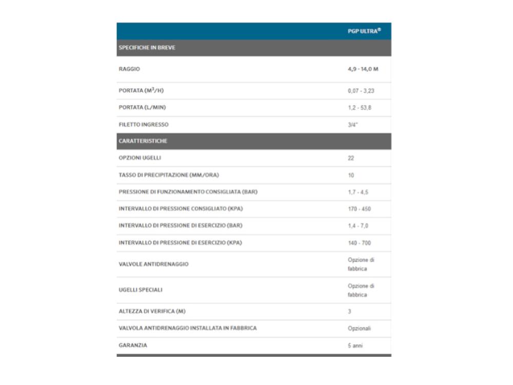Caractéristiques techniques de la turbine d'irrigation PGP Ultra