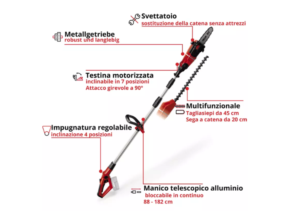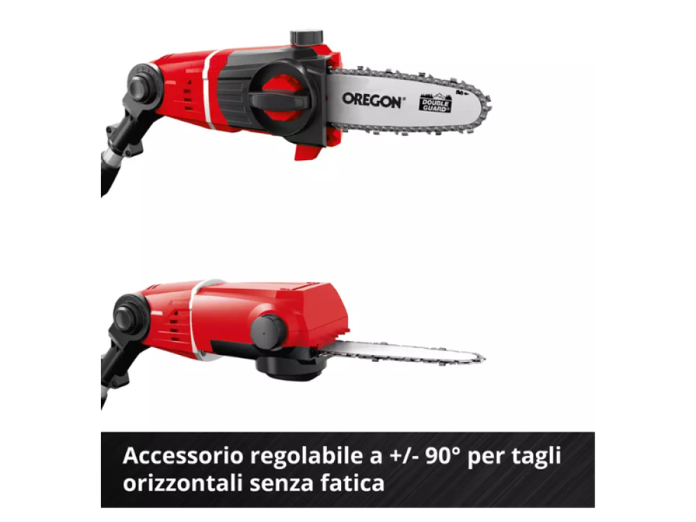 L'outil multifonctionnel sans fil GE-HC 18 Li T d'Einhell est un équipement puissant et polyvalent conçu pour élaguer les branches et couper les haies à haute altitude sans avoir besoin de connexions électriques. Avec des engrenages métalliques très résistants, une lame de qualité et une chaîne OREGON, cet outil garantit une coupe nette et précise. L'accessoire pivotant à 90° facilite les coupes horizontales sans effort, tandis que le système de lubrification automatique de la chaîne, via un réservoir d'huile intégré de 125 ml, préserve la durée de vie et les performances de la chaîne.