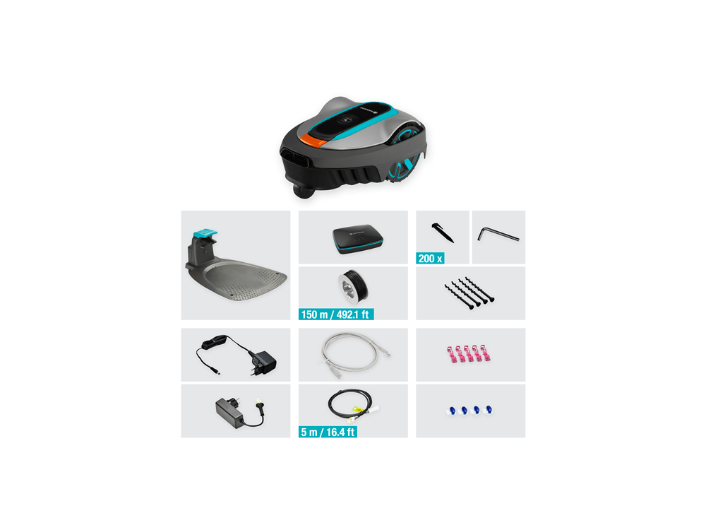 - Contenu : 1 x GARDENA smart SILENO city 250 m² Set, incl. 1 smart gateway, incl. 1 station de charge, incl. 1 câble périphérique de 150 m de long, incl. 200 crochets, incl. 4 connecteurs, incl. 5 pinces de connexion