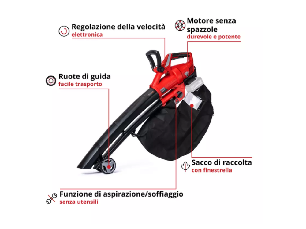 Ce modèle est particulièrement silencieux, avec un niveau sonore de 92,68 dB (A), et peut aspirer jusqu'à 720 m³/h, ce qui le rend parfait pour un nettoyage rapide et efficace. La vitesse de l'air peut atteindre 210 km/h, ce qui garantit un ramassage puissant des feuilles. Le diamètre du tuyau d'aspiration est de 100 mm, ce qui est idéal pour ramasser les feuilles et les débris les plus gros.