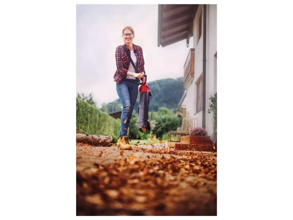 La poignée réglable assure une prise en main confortable, tandis que la sangle de transport répartit uniformément le poids, évitant ainsi la fatigue. Grâce à ses grandes roues, le souffleur peut être posé au sol pendant l'utilisation et poussé sans effort, ce qui allège la charge de l'utilisateur. Le sac de ramassage a une capacité de 45 litres et est équipé d'une fenêtre transparente qui permet de vérifier facilement le niveau de remplissage.