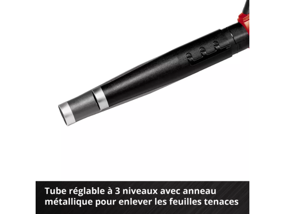 Un anneau métallique robuste à l'extrémité du tube protège l'outil contre les dommages, prolongeant ainsi sa durée de vie. Le support intégré permet d'accrocher le souffleur au mur, ce qui réduit l'encombrement lorsqu'il n'est pas utilisé.