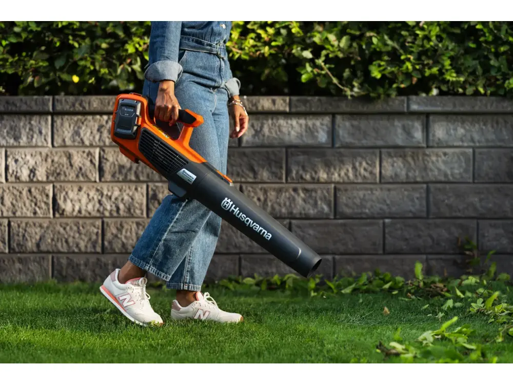Souffleur Husqvarna 122iB : léger, silencieux et complet avec batterie et chargeur inclus.