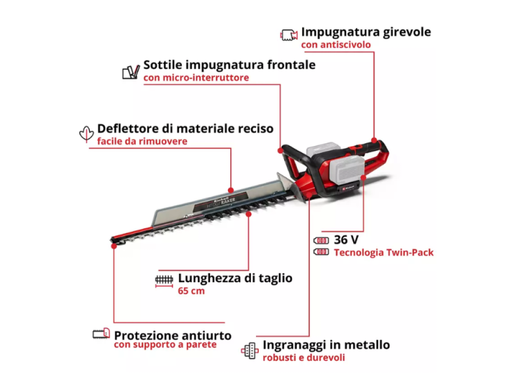 Le taille-haie sans fil GE-CH 36/65 Li-Solo d'Einhell offre une solution puissante et sans fil pour l'entretien des haies, des buissons et des arbustes dans le jardin. Faisant partie de la famille Power X-Change, le taille-haie utilise 2 batteries 18V (non incluses), assurant une flexibilité maximale grâce à la compatibilité avec tous les autres outils de la série Einhell.