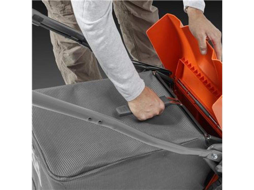 Le bac de ramassage ergonomique est solide, compact et placé en hauteur sur la tondeuse, ce qui facilite son retrait et sa remise en place. Il dispose également d'une grande ouverture et d'une poignée de soutien à l'arrière, ce qui permet de le vider très facilement.
