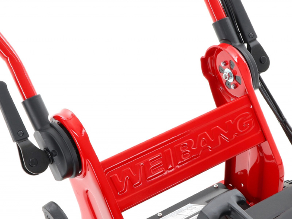 La tondeuse à essence WB466SCM de Weibang est équipée d'un pare-chocs avant qui protège le plateau de coupe et de poignées de déverrouillage rapide robustes.