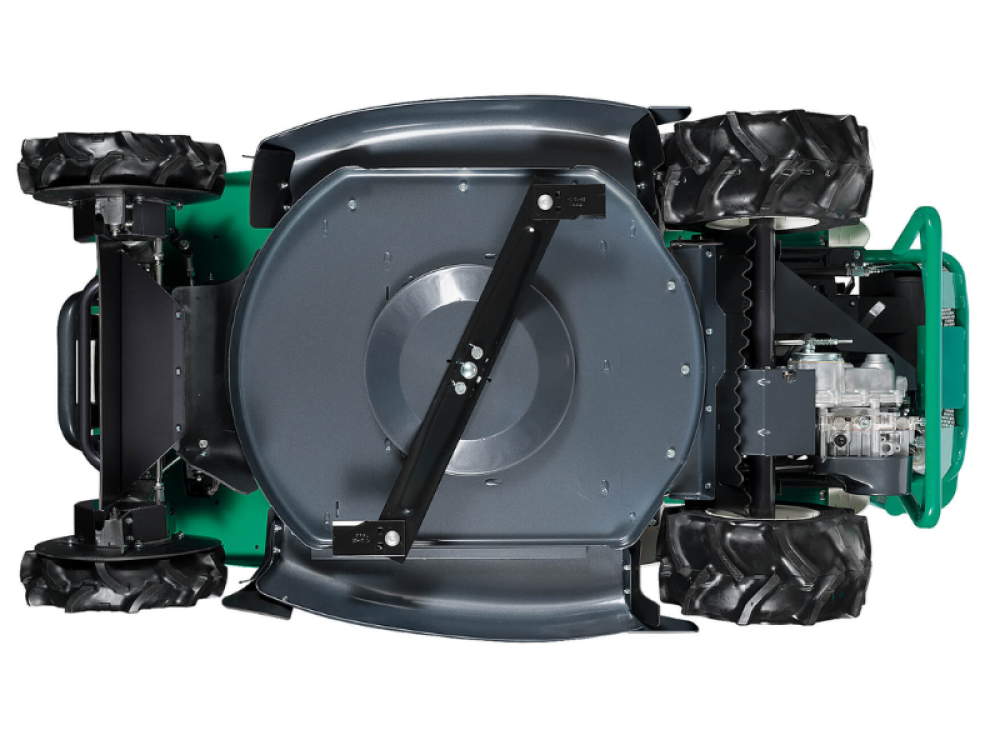 Le plateau de coupe en acier COR-TEN de 3,5 mm est équipé de deux lames flottantes capables de broyer des broussailles jusqu’à 30 mm de diamètre. La largeur de coupe de 97,5 cm et la hauteur réglable de 50 à 120 mm avec levier à vérin à gaz assurent précision et adaptabilité.