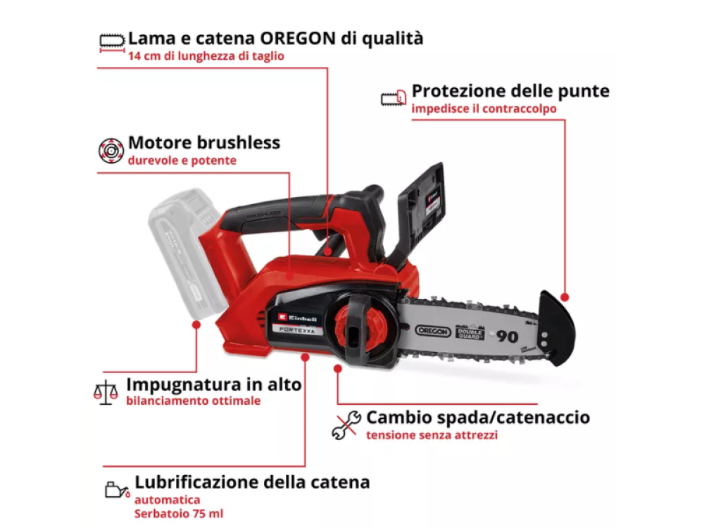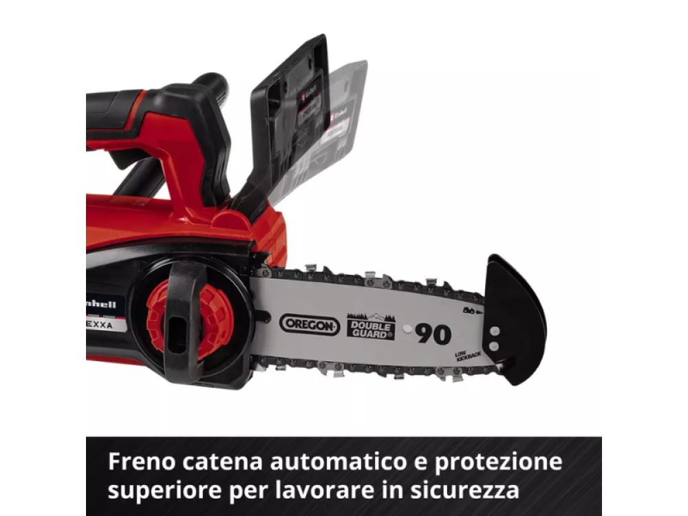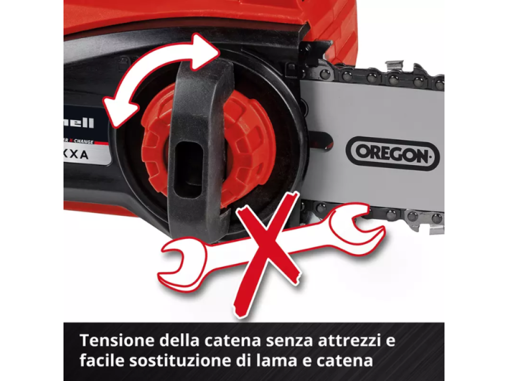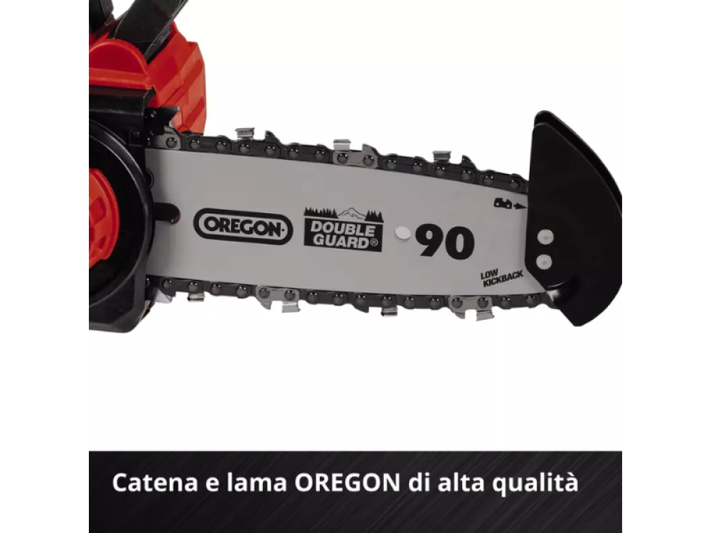 Cette tronçonneuse est équipée d'un moteur sans balais Einhell qui offre plus de puissance, d'autonomie et de durabilité que les moteurs à balais conventionnels. Le guide et la chaîne de qualité OREGON, d'une longueur de 20 cm et d'une capacité de coupe allant jusqu'à 14 cm, permettent de s'attaquer efficacement aux branches les plus épaisses.