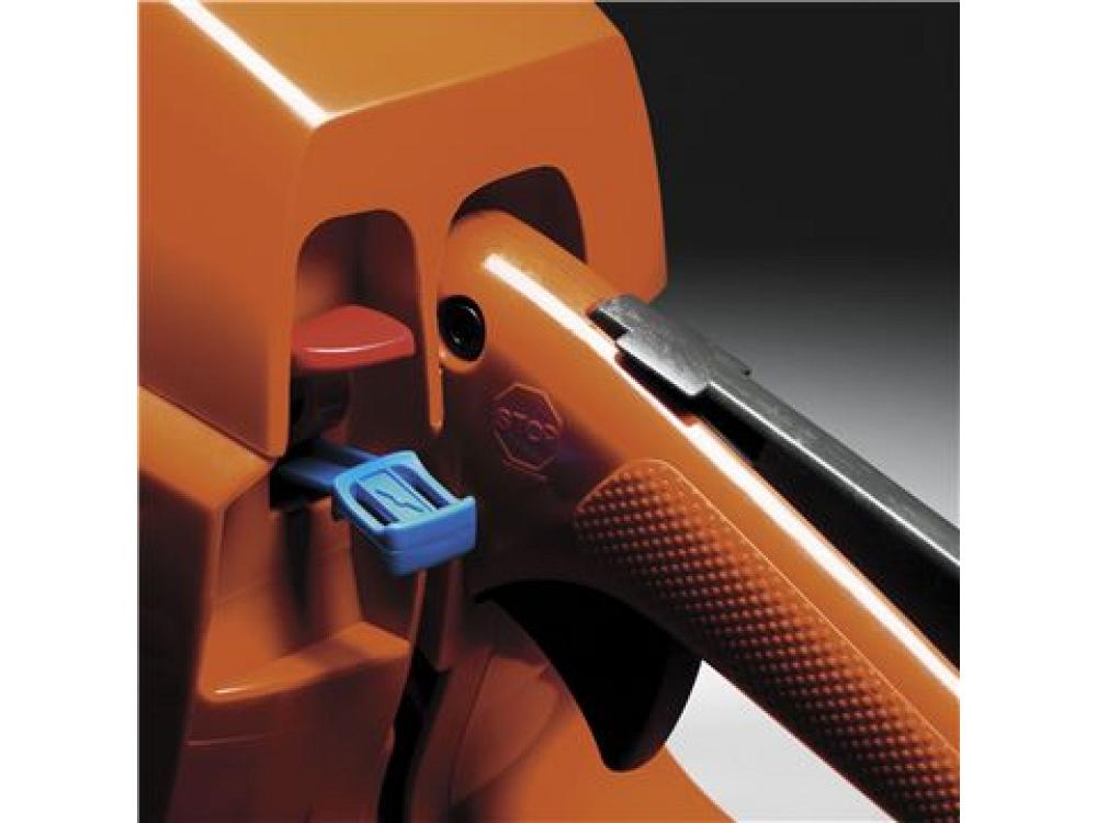 Pour plus de sécurité, le frein de chaîne à inertie s'active automatiquement en cas de rebond, réduisant ainsi le risque de blessure. En outre, l'amorce permet des démarrages rapides et faciles, tandis que la commande combinée air/arrêt empêche le moteur de se noyer, rendant la machine toujours prête à l'emploi.
