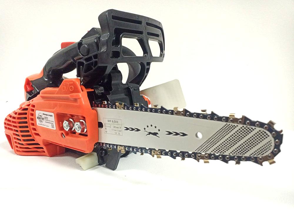 Équipée d'un moteur 2 temps de 25 cm3 de cylindrée et d'une puissance de 0,8 Kw, soit 1,1 CV, elle est fiable et adaptée à l'élagage et à l'ébranchage grâce à son guide de coupe (pointu) de 8" (20 cm). La chaîne en titane 1/4" 1,1 mm avec 50 maillons permet des coupes nettes et précises.