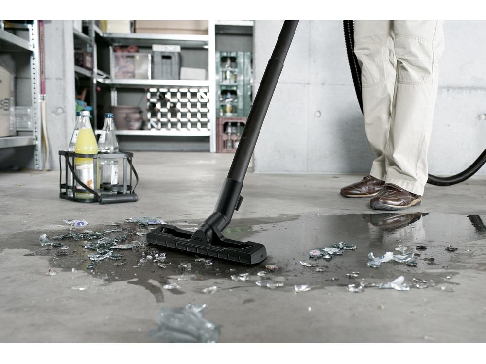 La position parking permet de garer le tuyau d'aspiration pour les pauses de travail. Le filtre à cartouche, que seul Karcher propose, permet d'aspirer les saletés liquides et solides sans avoir à changer le filtre. Compartiment de collecte en plastique. Filtre en mousse. Compartiment à accessoires intégré.