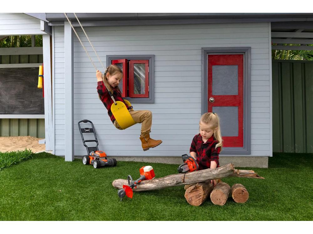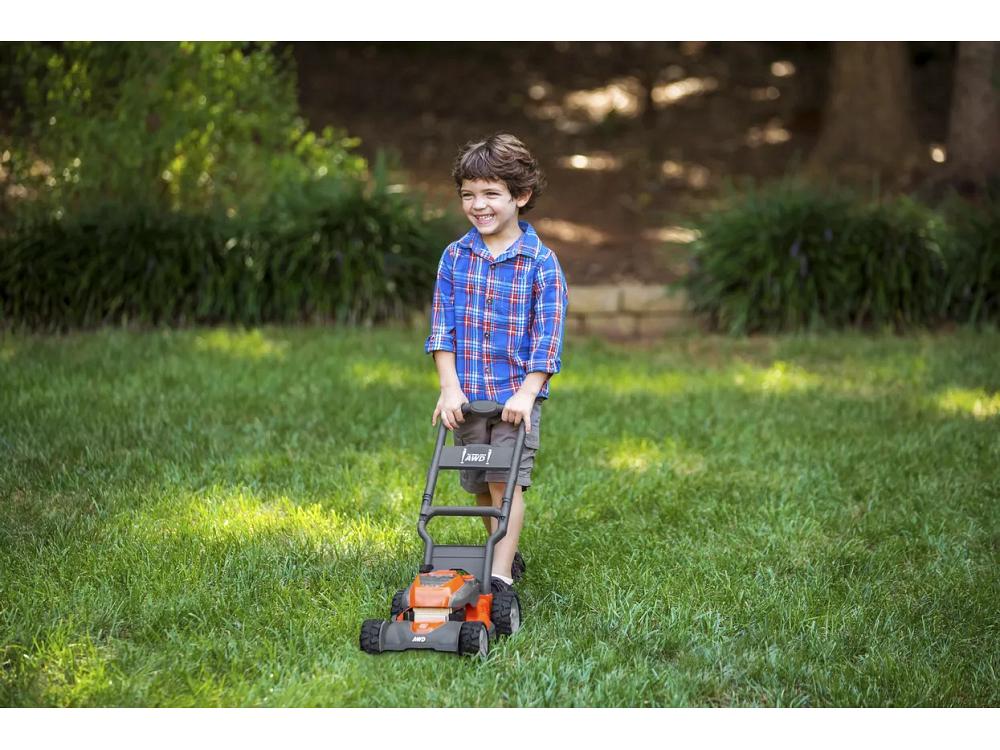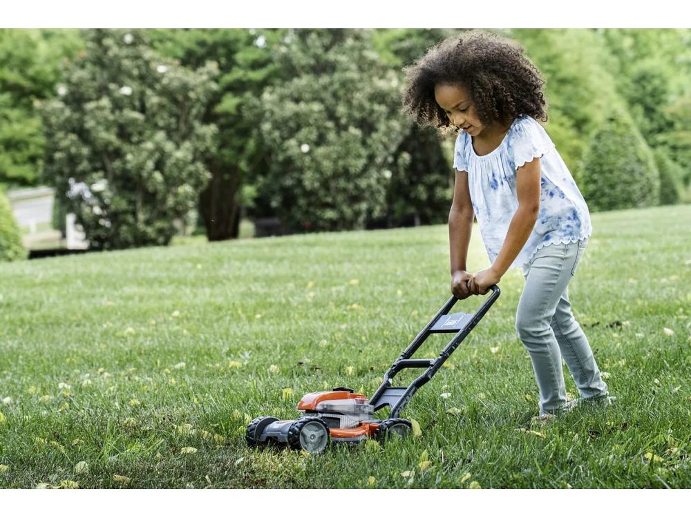 Tondeuse à gazon jouet Husqvarna pour les enfants de 3 ans et plus, bouton de démarrage et effet sonore originaux, équipée de lumières dans le carter du moteur.