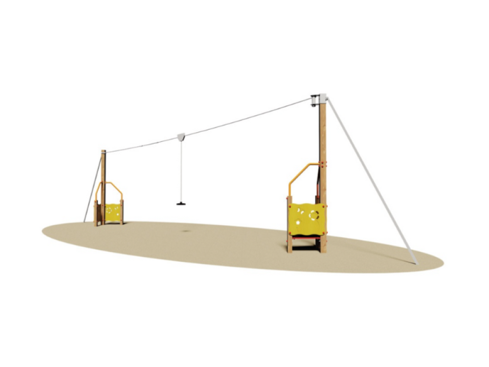 Le système de glissement est constitué d'un câble en acier galvanisé à plusieurs brins et équipé de dispositifs d'arrêt élastiques aux extrémités. Le siège est circulaire en caoutchouc antichoc avec un noyau intérieur en tôle d'acier pliée à la presse, suspendu à une chaîne à mailles étroites soudée et galvanisée à chaud.