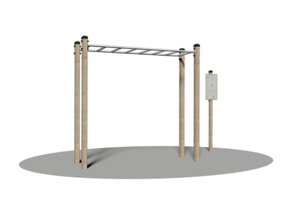 La structure est réalisée en bois lamellé-collé de pin nordique imprégné en autoclave avec des sels non toxiques, et se compose de 4 poteaux verticaux (9x9 cm) qui supportent uncadre d'escalade horizontal en acier galvanisé à chaud de Ø 4 cm. Les poignées ergonomiques antidérapantes garantissent une excellente prise en main et une grande sécurité pendant l'exercice.