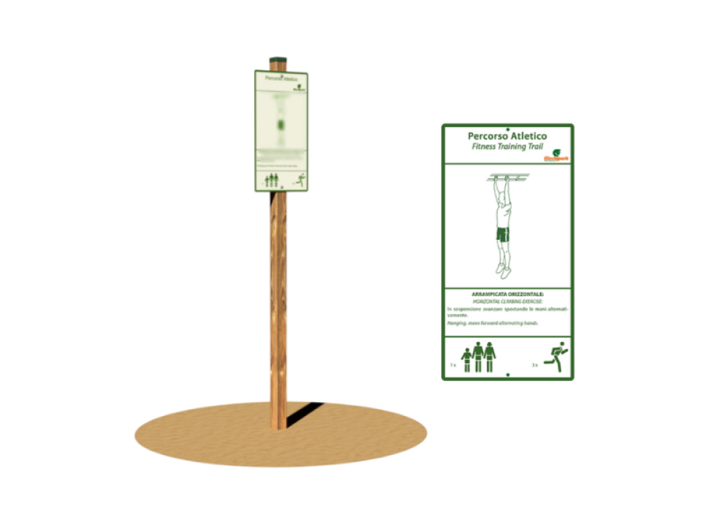 La station comprend un panneau d'information en aluminium Dibond® (62x33 cm, 3 mm d'épaisseur), avec la description de l'exercice et le nombre de répétitions recommandées. Le panneau est soutenu par un poteau en lamellé-collé de 7x7 cm, d'une hauteur de 250 cm à enterrer.