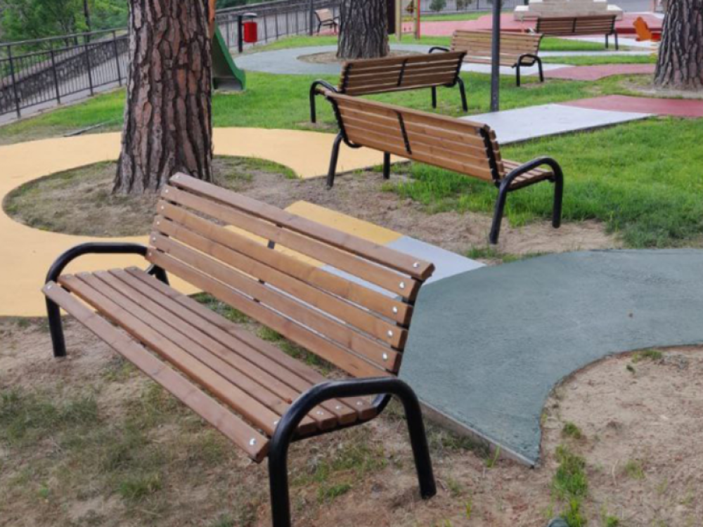 La structure du banc est composée de deux supports en tube d'acier Ø 50 mm avec accoudoirs intégrés, garantissant stabilité et praticité. Le dossier et l'assise sont constitués de douze lames de bois de pin nordique, imprégnées en autoclave avec des sels non toxiques pour résister aux intempéries.