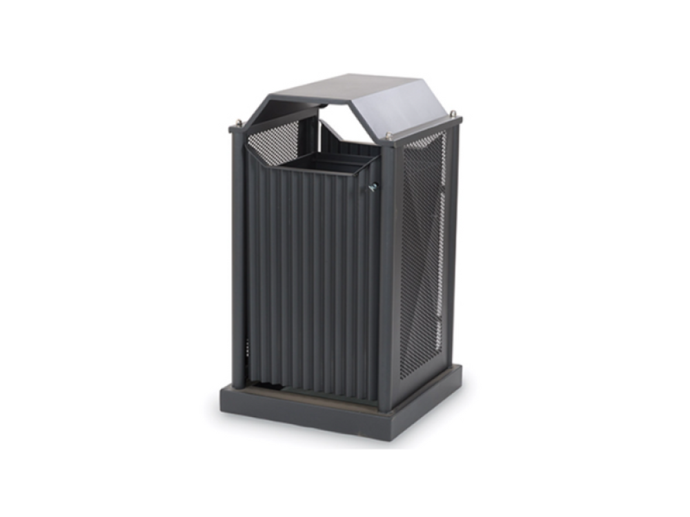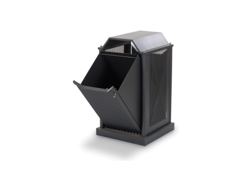 Le panier intérieur est en tôle d'acier et équipé de barres transversales internes pour la fixation du sac. L'ouverture à charnière permet un accès facile pour le vidage et l'entretien. Le système de verrouillage à clé fourni assure la sécurité et empêche tout accès non autorisé.