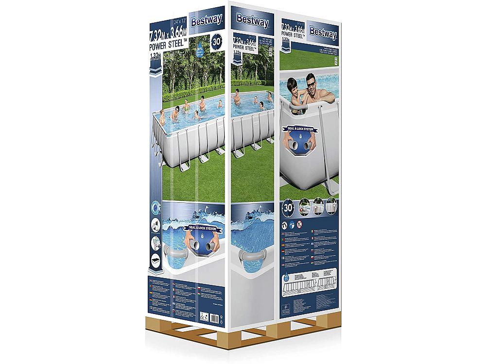 En outre, l'ensemble de la structure est soutenu par un grand squelette métallique tubulaire galvanisé inoxydable. Bestway 56475 est une grande piscine de jardin rectangulaire de 732x366x132cm, idéale pour toute la famille et livrée avec la pompe à filtre à sable Flowclear™ 58497, le flotteur ChemConnect™, l'échelle et la couverture.