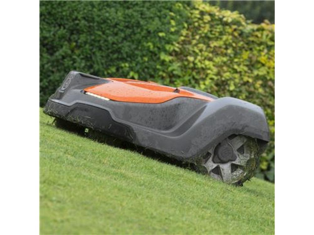 Voici la Husqvarna Automower 310 Mark II, une tondeuse robot à 4 roues pour les petits jardins complexes ou les grandes pelouses relativement simples.